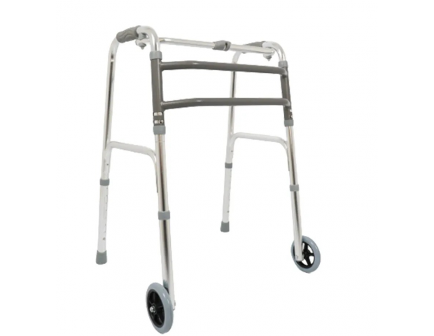 Acompanha 1 par de rodas e 1 par de pernas com ponteiras. Pode ser utilizado como andador fixo ou com rodas.