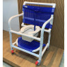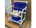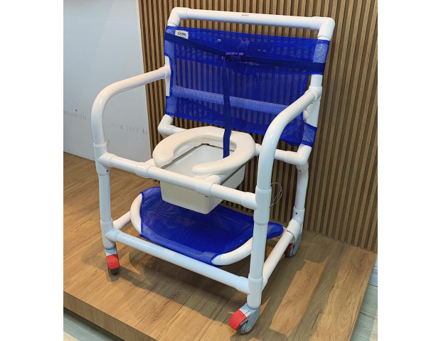 Cadeira de banho c/rodas, fabricada em PVC, vinil e tela poliéster, para uso no sanitário e chuveiro.