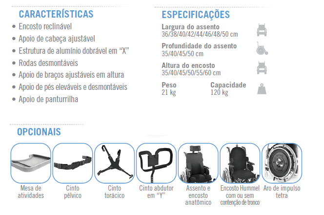 A AVD Reclinável vem com vários itens de série: apoios de pés eleváveis, apoio de panturrilha, apoio de cabeça acolchoado e com múltiplas regulagens e rodas anti-tombo integrados, além disso conta com opcionais que aumentam ainda mais o conforto tais como encosto anatômico Hummel, controles de tronco e diversos tipos de cintos.