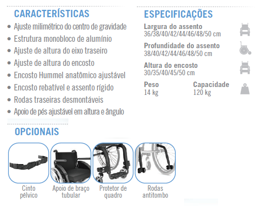 Cadeira ativa com chassis monobloco totalmente ajustável.