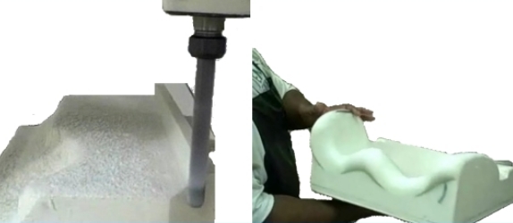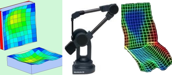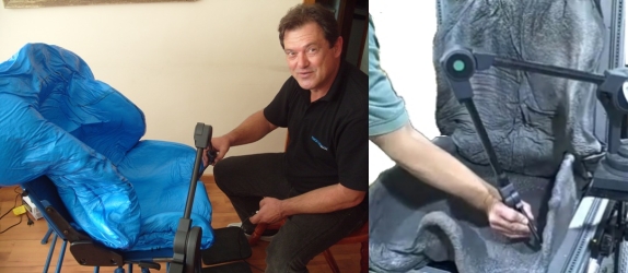2-Digitalizando a superfície modelada Nesta etapa com auxílio de um scanner tridimensional a superfície modelada é digitalizada e os dados são enviados para um computador em tempo real. Uma vez no computador a imagem é tratada para eliminar possíveis imperfeições da superfície. A imagem do molde do corpo do paciente é enviada para o computador com máxima fidelidade. Na figura abaixo você pode observar o profissional realizando a digitalização do molde e a imagem 3D já digitalizada no computador. |