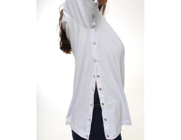 Camiseta com abertura lateral · Descrição: Camiseta desenvolvida para pós-operatórios e pessoas com mobilidade reduzida. Sua abertura lateral com botões de pressão facilita na hora da troca de curativos ou de colocar e tirar a camiseta para quem tem pouca mobilidade nos membros superiores. Tecido: malha 100% algodão Disponível em 3 cores: Branco, Preto e Verde petróleo Lavável em máquina de lavar roupasAVISO: PRAZO DE ENTREGA ATÉ 30 DIAS