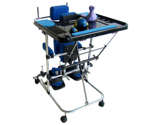 Estabilizador vertical regulável com ajustes de altura para estabilização de tronco e quadril, almofadas torácicas e lombares, com regulagens de altura, largura, e profundidade; abdutores e extensores de membros inferiores com regulagens de altura, largura e profundidade; basculação do apoio de pés independente e mesa de atividades. Através do sistema de inclinação do conjunto permite-se maior ou menor tomada de peso em membros inferiores.