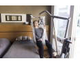 Flexibilidade do equipamento tanto na sua estrutura mecânica pela diversidade de ajustes de altura, abertura de ângulo do levante e do posicionamento do sellete (rede envolvente entrelaçada em fios de nylon revestidos em poliuretano com malha de pequeno diâmetro) permitindo fazer a transferência do usuário da cama (residencial, hospitalar), banheiro (box, vaso sanitário), cadeiras de rodas (manuais, motorizadas, scooters), no cotidiano (cadeiras, poltronas) em terapias de reabilitação (tablado, tatame, maca) etc...