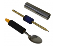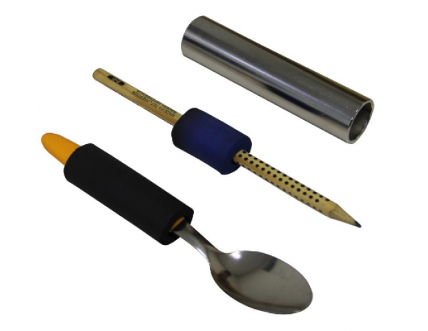 Facilitador com tubo cromado pesado, dois receptores em cada ponta, um para talher, outro para um lápis, caneta, pincel. O talher poderá ser reto ou curvo, metal ou plástico, com ou sem balancinho. Indicação Para tremores e movimentos involuntários distais.