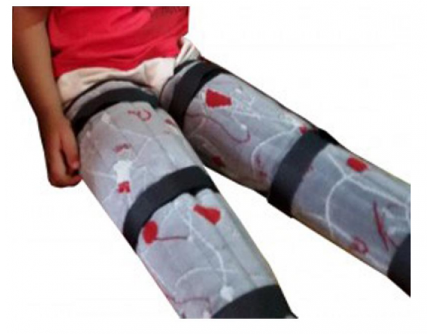 Órtese para inibir padrão flexor, em tecido almofadado, com barbatanas em PVC cilíndrico.